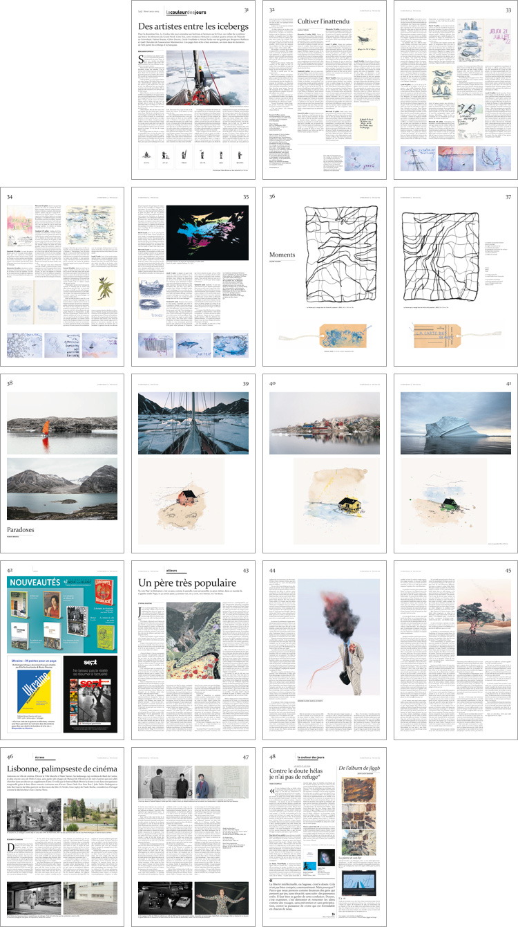 Pour la deuxième fois, La Couleur des jours emmène ses lectrices et lecteurs sur le Knut, un voilier de 15 mètres qui brave les éléments du Grand Nord. Cette fois, cette résidence flottante a conduit quatre artistes de l’Islande au Groenland. Fabian Branas, Céline Ducret, Cécile Fouillade et Alexia Turlin ont été guidés par Benjamin Ruffieux et Gaël Chevalier de l’association Marémotrice. Ces pages font écho à leur aventure, un mois dans les lumières de l’été parmi les icebergs et la banquise.